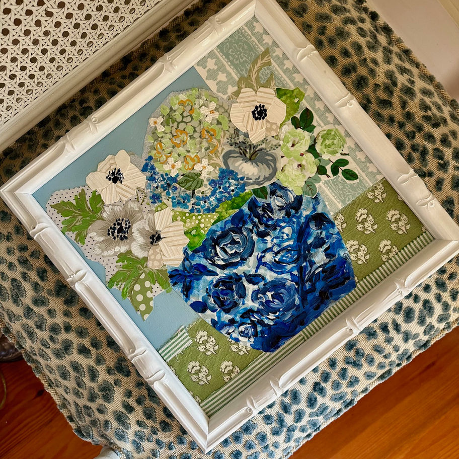 The Blue Muse Limited Collection. Featuring a series of coastal inspired chinoiserie florals in serene blues and greens with magnolias and hydrangeas. This signature collage painting by Carolyn Shultz comes framed in a gloss white faux bamboo frame. Signed on the back. Price includes shipping within the continental US