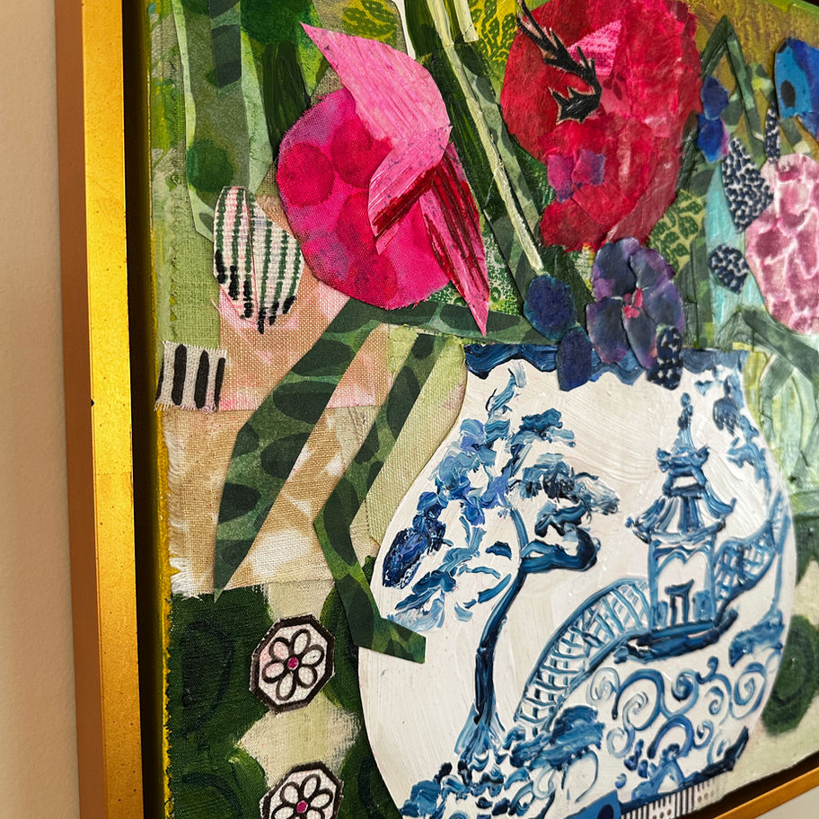 BRAND NEW SERIES! Injecting both whimsy and vibrant color, Fresh Cut II is part of a mini collection release of FOUR zingy florals each framed in a beautiful gold leaf floater frame. Chinoiserie ginger jars with bold abstract blooms feature my signature collage elements and playful textures of papers and fabric woven throughout. Perfect for art lovers seeking a unique addition to their art collection that brings charm and personality to any space.