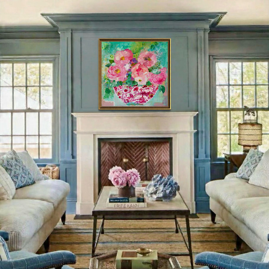 Welcome Spring to your home with this large scale abstract floral collage painting of coral pink peonies in a fuchsia chinoiserie bowl. Layers upon layers of texture with subtle hints of gold leaf and metallic are woven throughout this mixed media piece. Feminine beauty and charm blend seamlessly with a touch of whimsical playfulness, making this cheery floral composition a radiant focal point for any space from traditional to comtemporary.